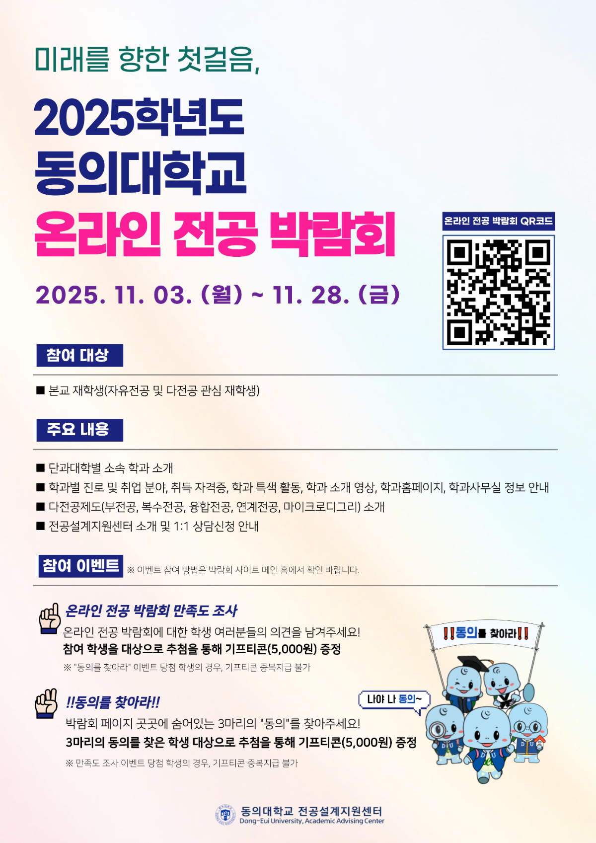전공설계지원센터에서는 학생들의 학과(전공) 이해도를 제고하고, 합리적인 전공 선택을 지원하기 위해 2025학년도 동의대학교 온라인 전공 박람회를 다음과 같이 개최하고자 합니다. 학생들의 많은 참여 부탁드립니다.