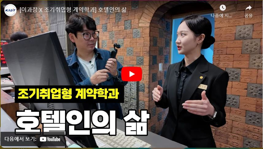 2024년 10월 08일(화) 스마트호스피탈리티학과 학과장 김권동 교수와 2학년 김수민 학생이 유튜버 '이과장' 촬영을 하였다. 조기취업형계약학과 홍보 및 참여기업 소개와 재학생의 회사 생활에 대한 내용을 인터뷰하였다.
